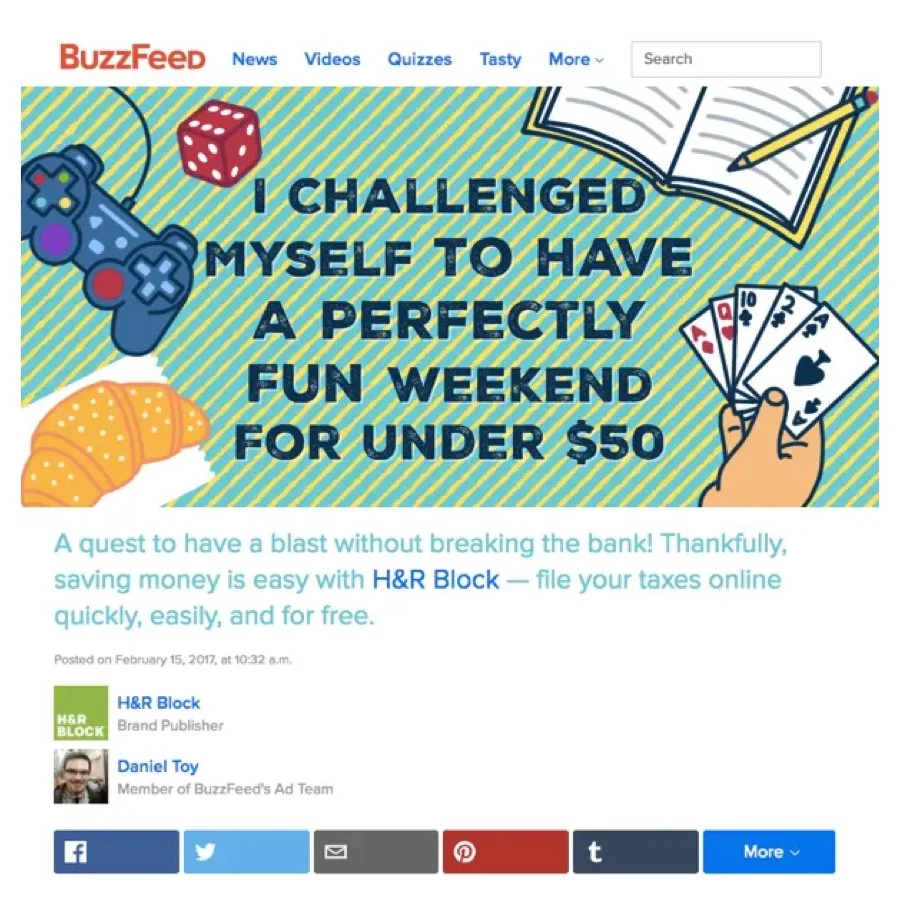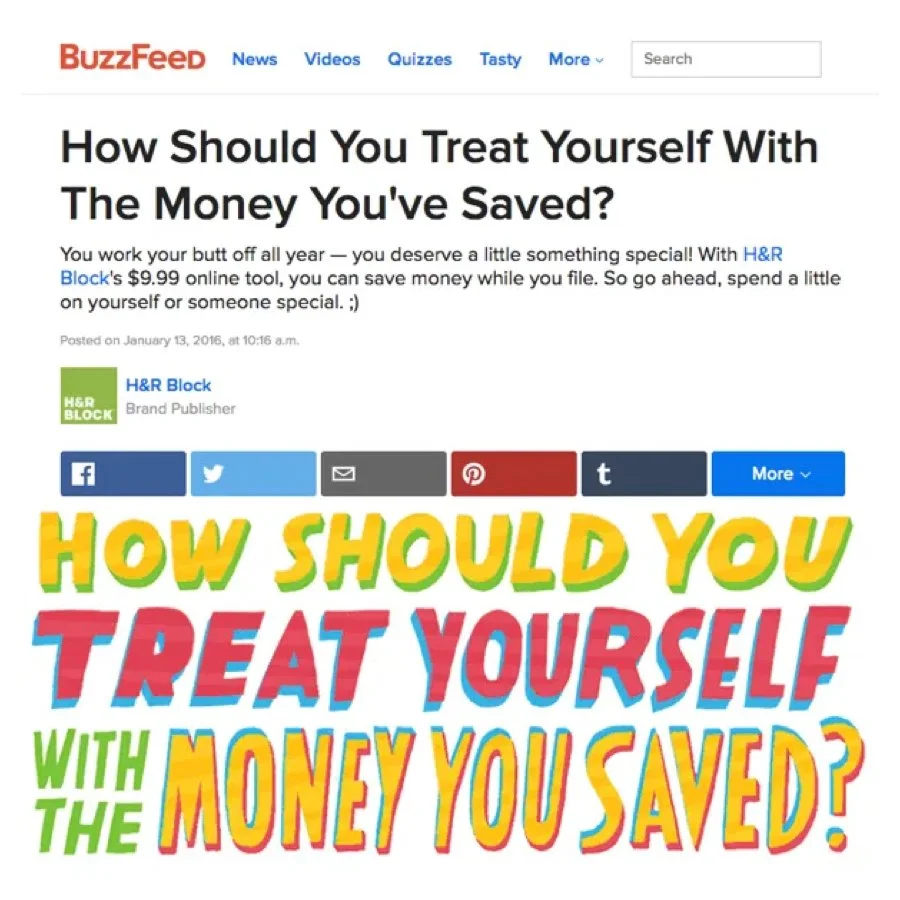 I conceptualized a BuzzFeed quiz centered around the "Treat Yo Self!" mentality. The post was titled "How Should You Treat Yourself With The Money You've Saved?" By using this interactive quiz, we not only got millennials engaged in the tax conversation - we learned about them. Would they rather save money skipping their daily coffee or a monthly massage? As we learned more about the individuals engaging with the quiz, we knew we could create better, more relevant content as the campaign progressed.